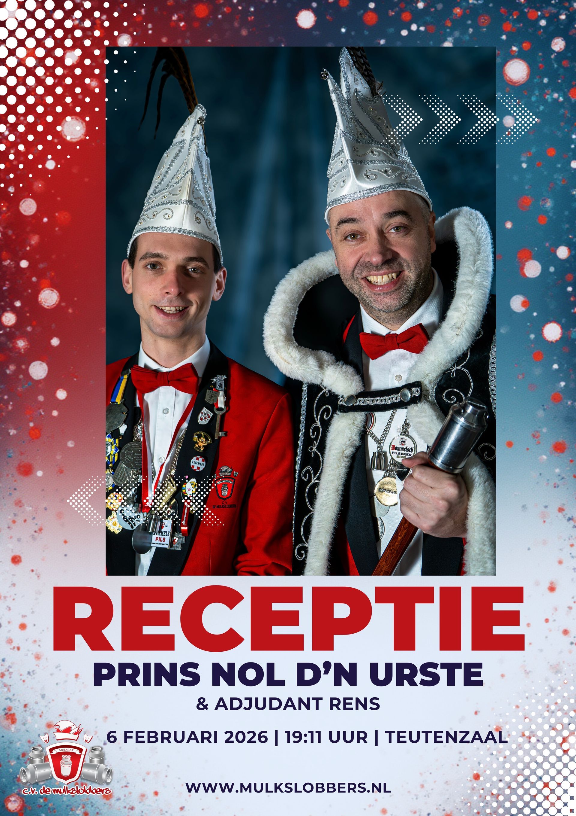 Vanavond staat de Prinsenreceptie op het programma, en wel in ons mooie Mulkgat. Prins... zal u verwelkomen en we gaan er een geweldige avond van maken. Aanvang 19:11 uur in onze Teutenzaal.