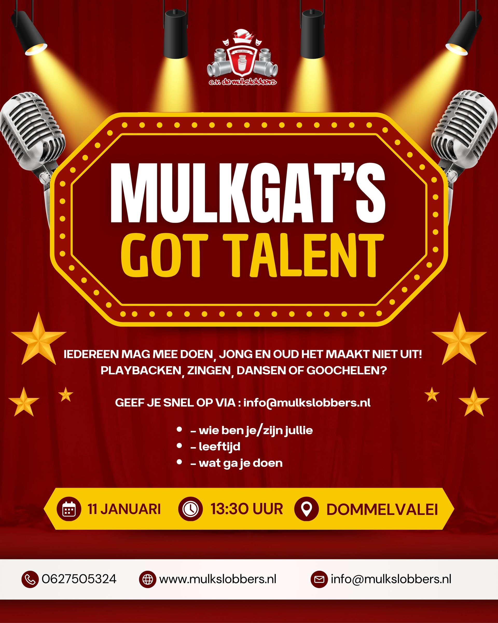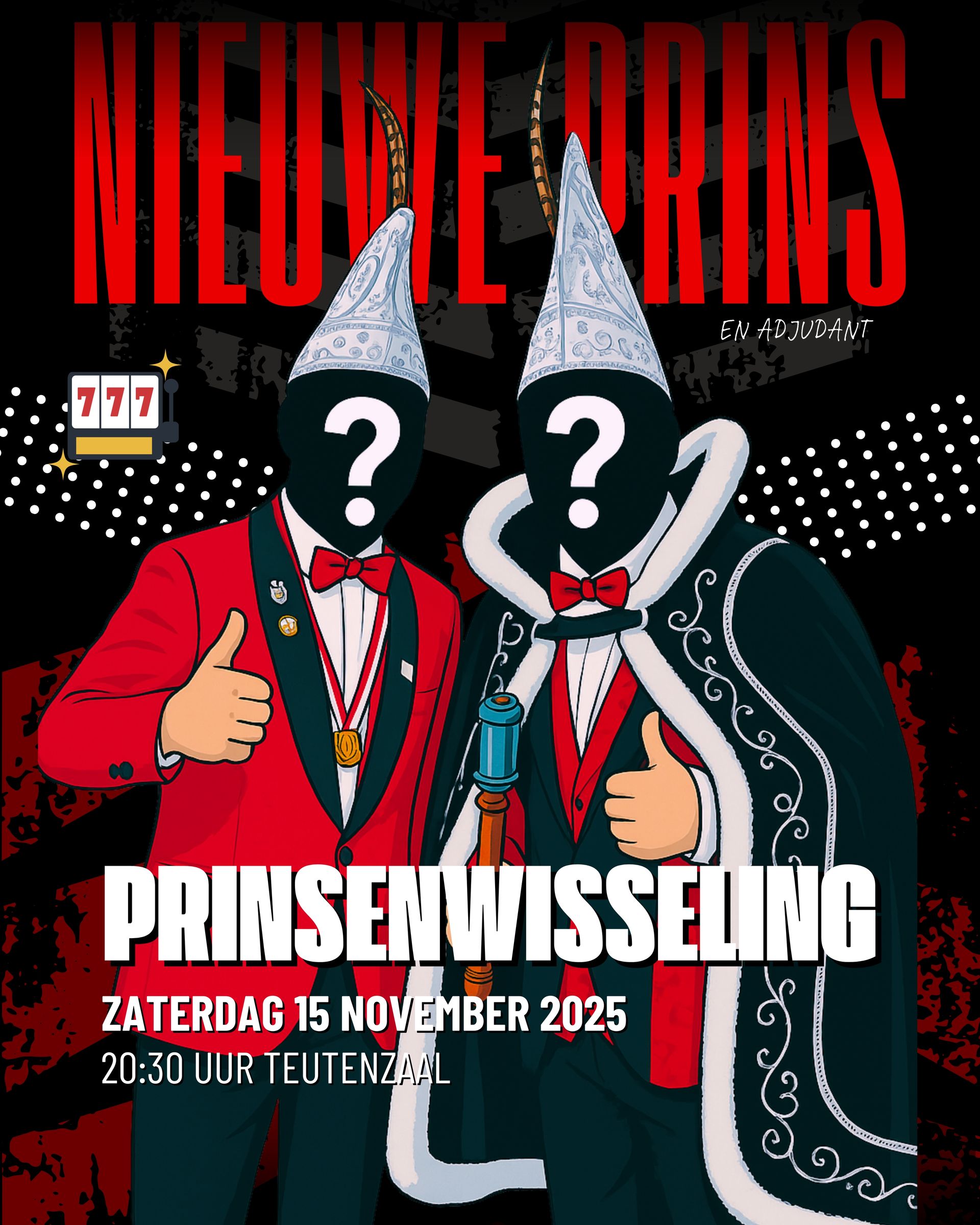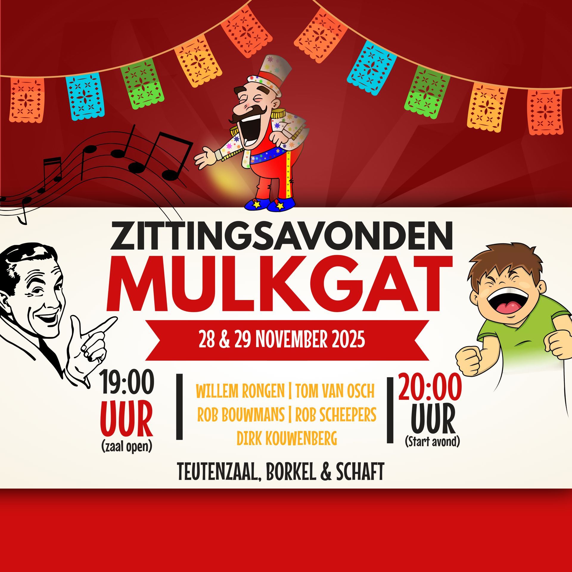 Op zaterdag 15 november 2026 komen we erachter wie de nieuwe Prins en Adjudant van Mulkgat gaan worden. Het zal een gezellige avond gaan worden met een spannende ontknoping! We zien jullie graag om 20:30 uur in de Teutenzaal.